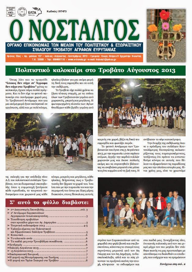Κυκλοφόρησε το νέο φύλλο της εφημερίδας των Τροβατιανών ''Ο ΝΟΣΤΑΛΓΟΣ'' τεύχος 137